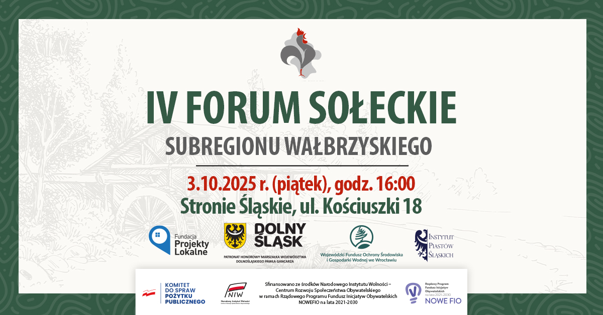 Zapraszamy na IV Forum Sołeckie Subregionu Wałbrzyskiego! Wydarzenie odbędzie się 3 października 2025 r. w Centrum Edukacji Turystyki i Kultury (Stronie Śląskie, ul. Kościuszki 18) o godz. 16:00.